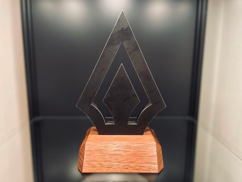 Spydet er vannskåret i 15 mm stål og har fått en overflatebehandling med glassblåsing og klarlakk, sponset av Lakkereren AS. Trebasen er håndlaget av brannkonstabel og frivillig i Norsk Folkehjelp, Mathias Hagen.